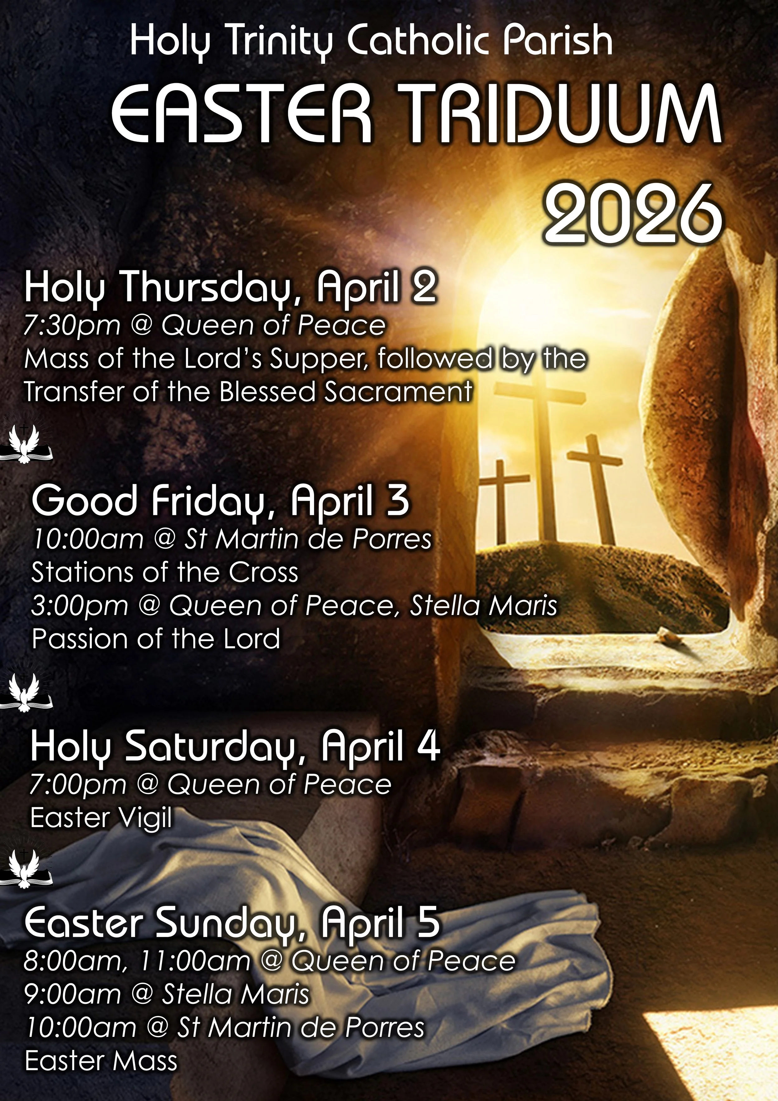 Mission: at Holy Trinity Catholic Parish, we celebrate God’s presence through prayer, worship, and the sacraments, uniting all in Christ’s love. Inspired by the Holy Trinity, we are committed to living and sharing God’s love through hope, faith, service, and transparent care for all.